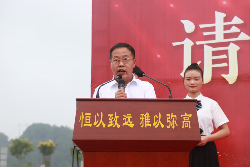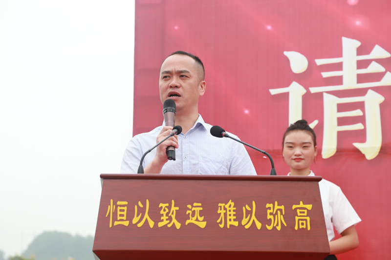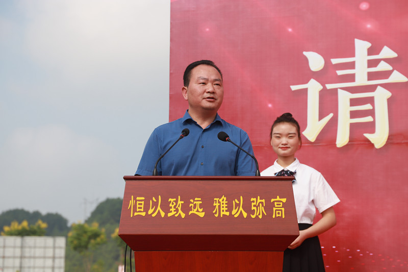 廖校長為各年級授旗,創(chuàng)新部主任梁莊貴、高三年級主任李武志、高二年級主任薛代秀、高一年級主任楊長勛從廖校長手中接過象征本年級靈魂的年級旗。